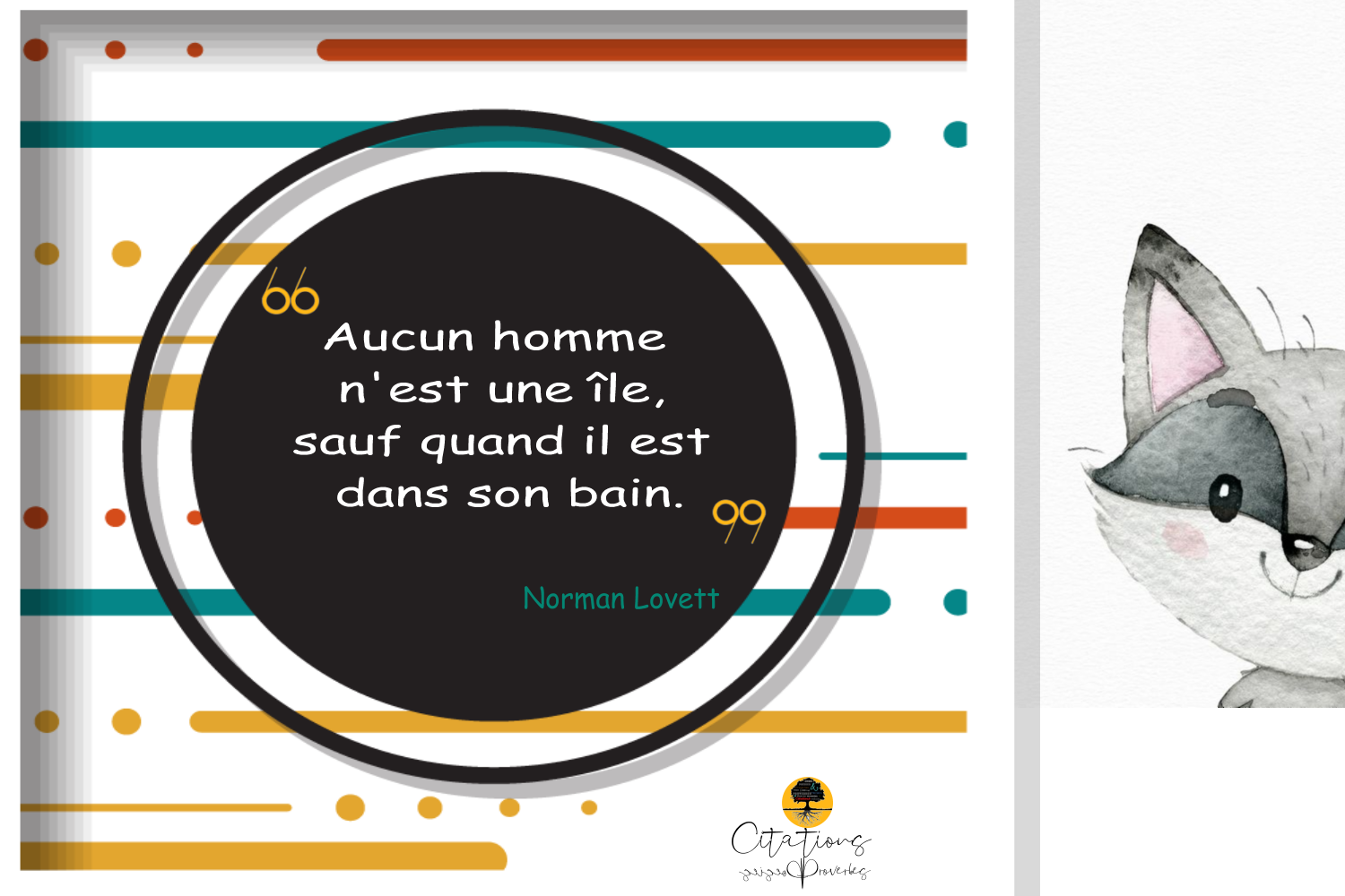 Citations Aucun homme n’est une île, sauf quand il est dans son bain. 19 Share Aucun homme n’est une île, sauf quand il est dans son bain. Norman Lovett 19 Share