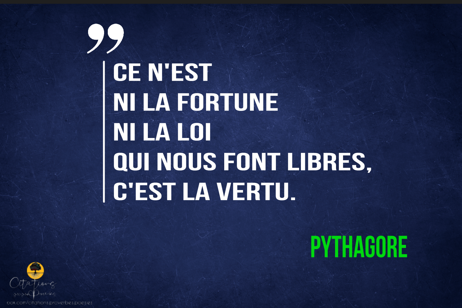 Citations Ce n’est ni la fortune ni la loi qui nous font libres, c’est la vertu. 144 Share ”Ce n’est ni la fortune ni la loi qui nous font libres, c’est la vertu.” Pythagore 144 Share