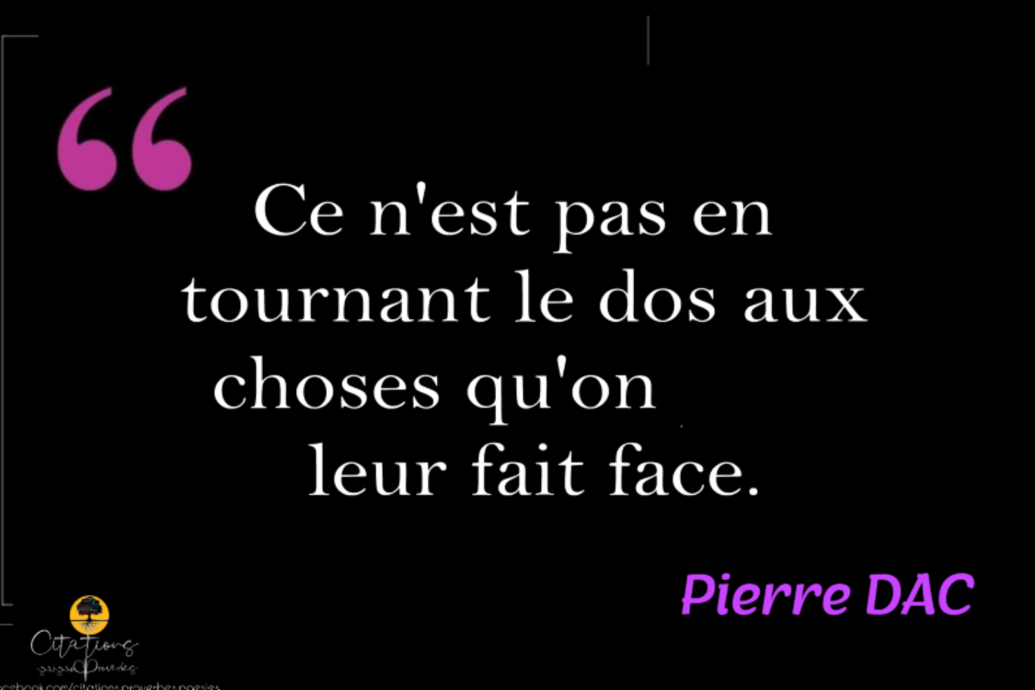 Citations Ce n’est pas en tournant le dos aux choses qu’on leur fait face. 33 Share Ce n’est pas en tournant le dos aux choses qu’on leur fait face. Pierre DAC 33 Share