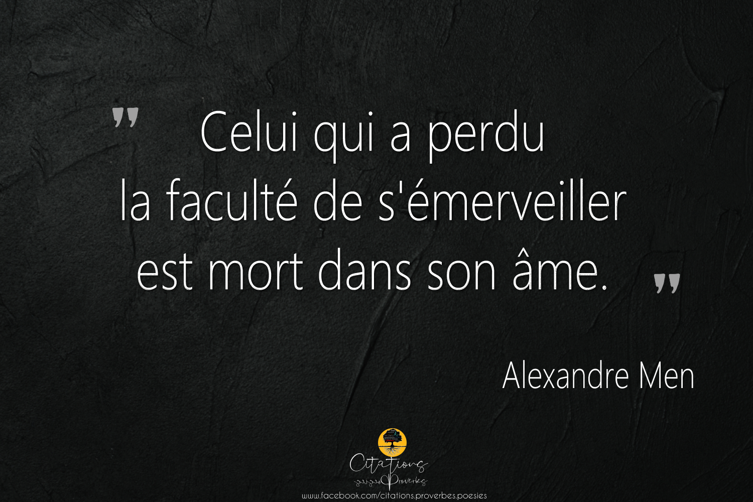 Citations Celui qui a perdu la faculté de s’émerveiller est mort dans son âme. 66 Share Celui qui a perdu la faculté de s’émerveiller est mort dans son âme. Alexandre Men 66 Share