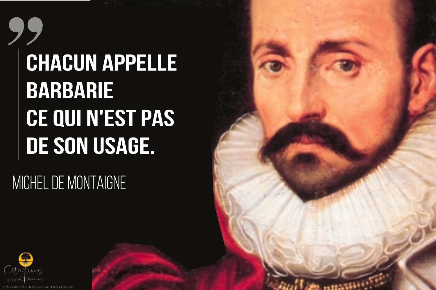Citations Chacun appelle barbarie ce qui n’est pas de son usage. 67 Share ”Chacun appelle barbarie ce qui n’est pas de son usage.” Michel de Montaigne 67 Share