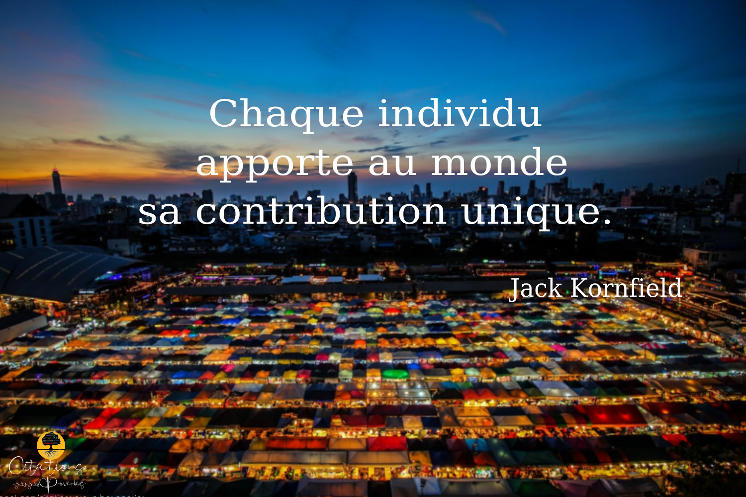 Citations Chaque individu apporte au monde sa contribution unique. 41 Share Chaque individu apporte au monde sa contribution unique. Jack Kornfield 41 Share