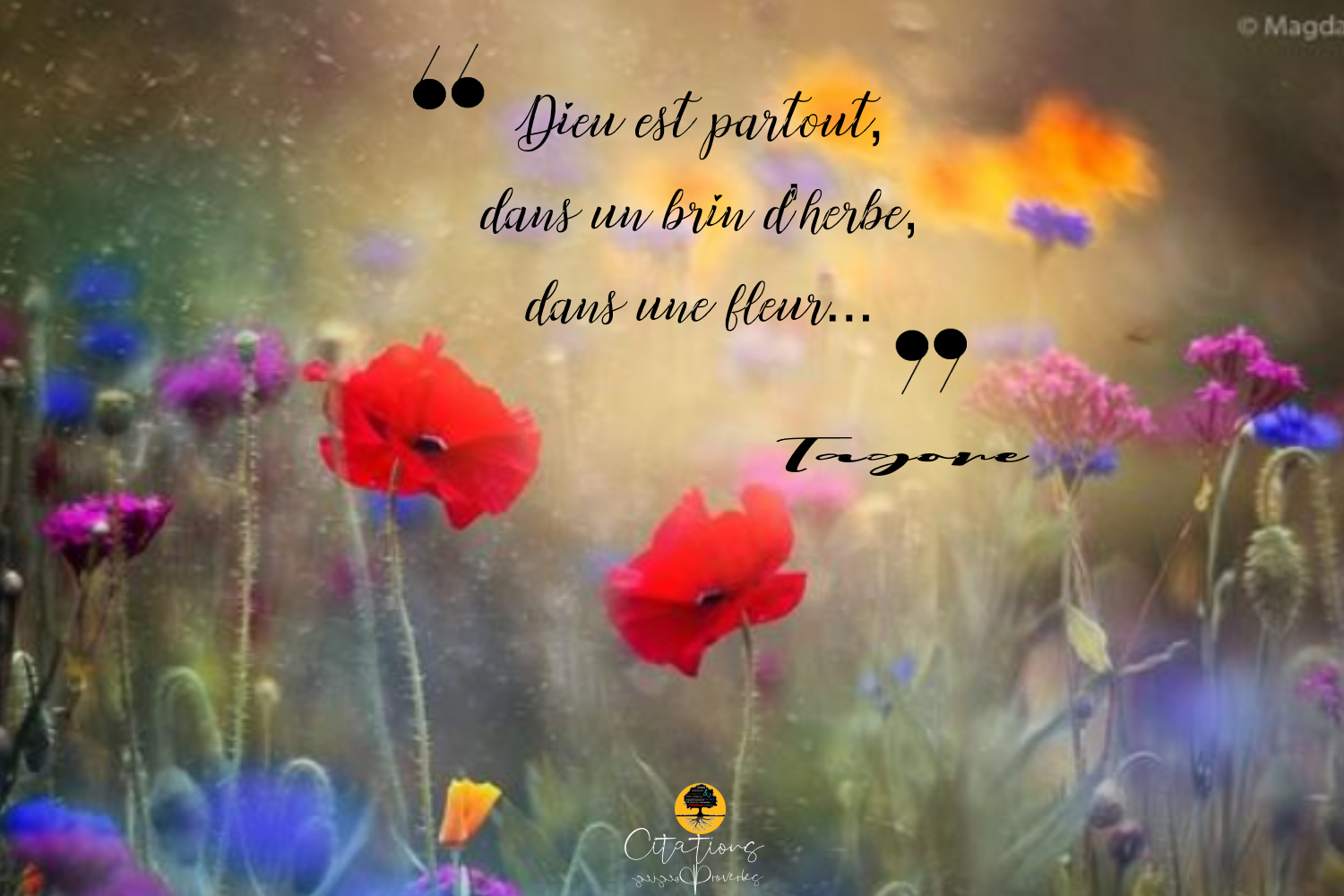 Citations Dieu est partout, dans un brin d’herbe, dans une fleur… 249 Share Dieu est partout, dans un brin d’herbe, dans une fleur… Tagore 249 Share