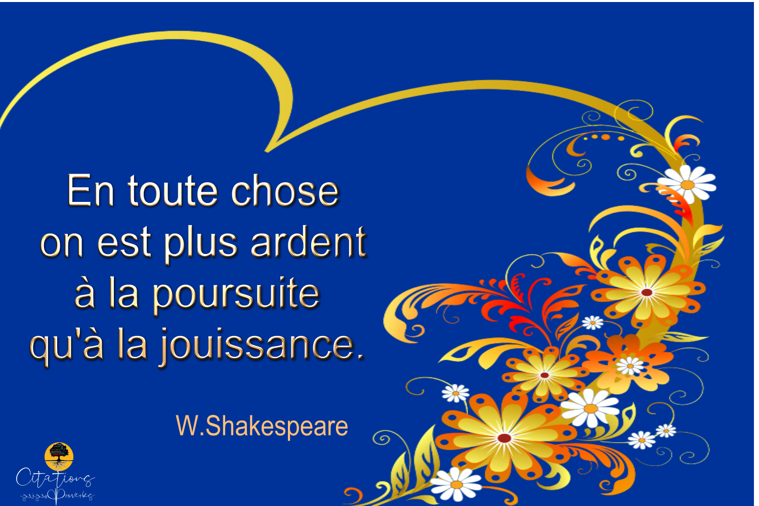 Citations En toute chose on est plus ardent à la poursuite qu’à la jouissance. 80 Share En toute chose on est plus ardent à la poursuite qu’à la jouissance. W.Shakespeare 80 Share