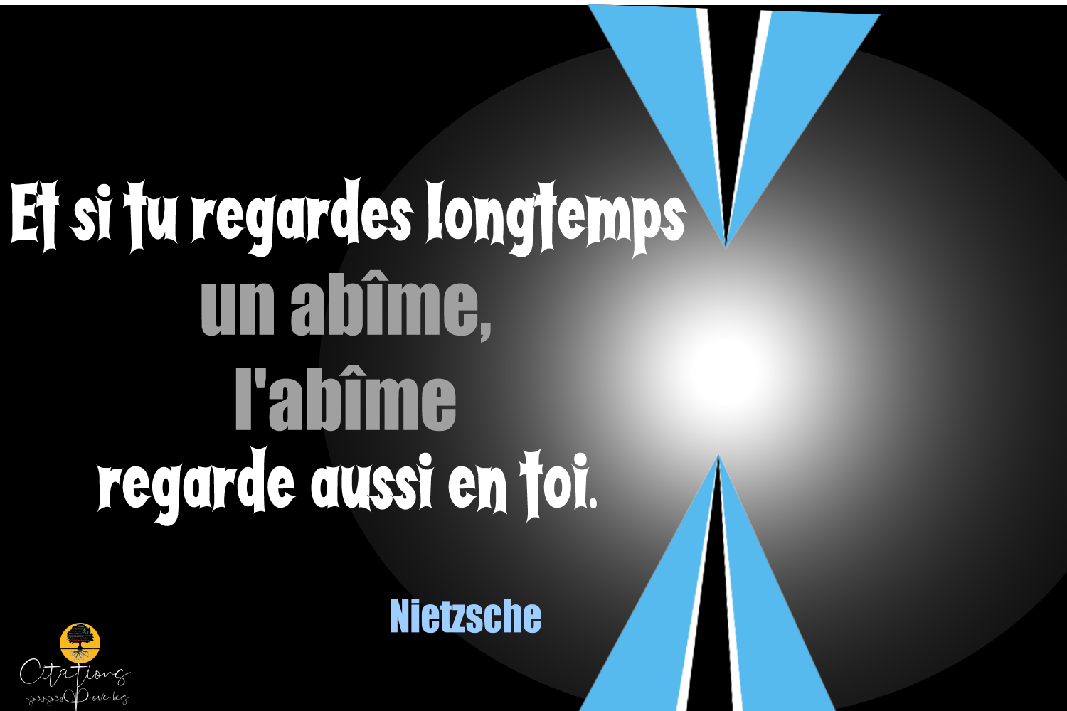 Citations Et si tu regardes longtemps dans l’abîme… 15 Share Et si tu regardes longtemps dans l’abîme l’abîme regarde aussi en toi. Nietzsche 15 Share