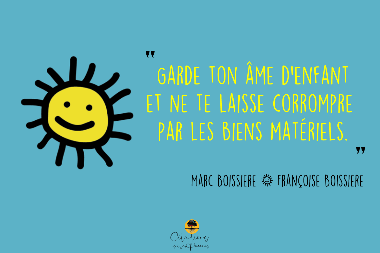 Citations Garde ton âme d’enfant … 105 Share Garde ton âme d’enfant et ne te laisse corrompre par les biens matériels. Marc Boissiere & Françoise Boissiere 105 Share