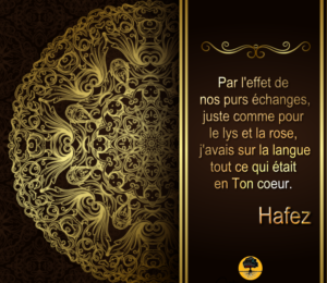 Poésie Hafez 328 Share Par l’effet de nos purs échanges, juste comme pour le lys et la rose, j’avais sur la langue tout ce qui était en Ton cœur. Hafez 328 Share