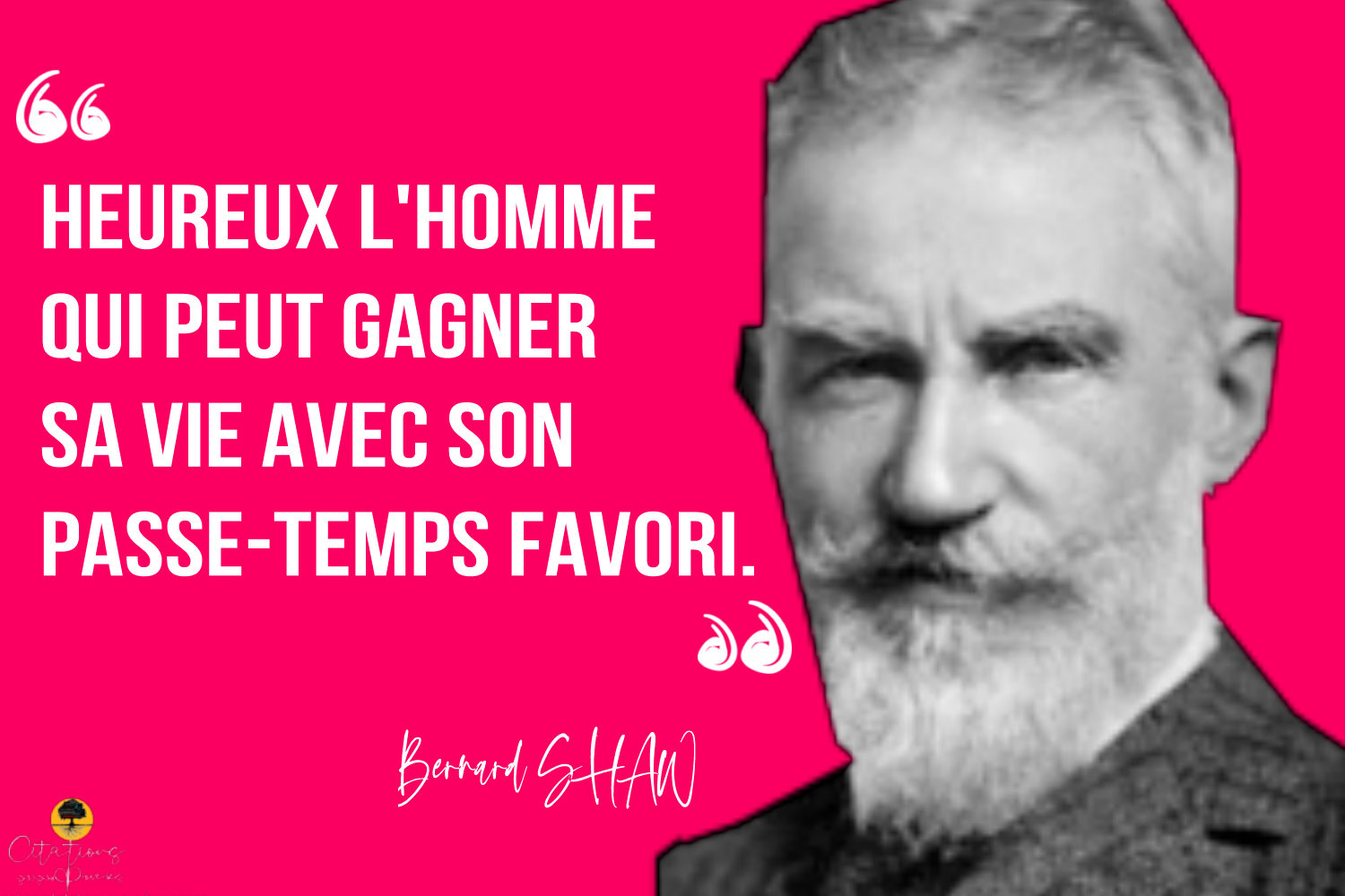 Citations Heureux l’Homme qui peut gagner sa vie avec son passe-temps favori. 77 Share ” Heureux l’Homme qui peut gagner sa vie avec son passe-temps favori.” Bernard SHAW 77 Share