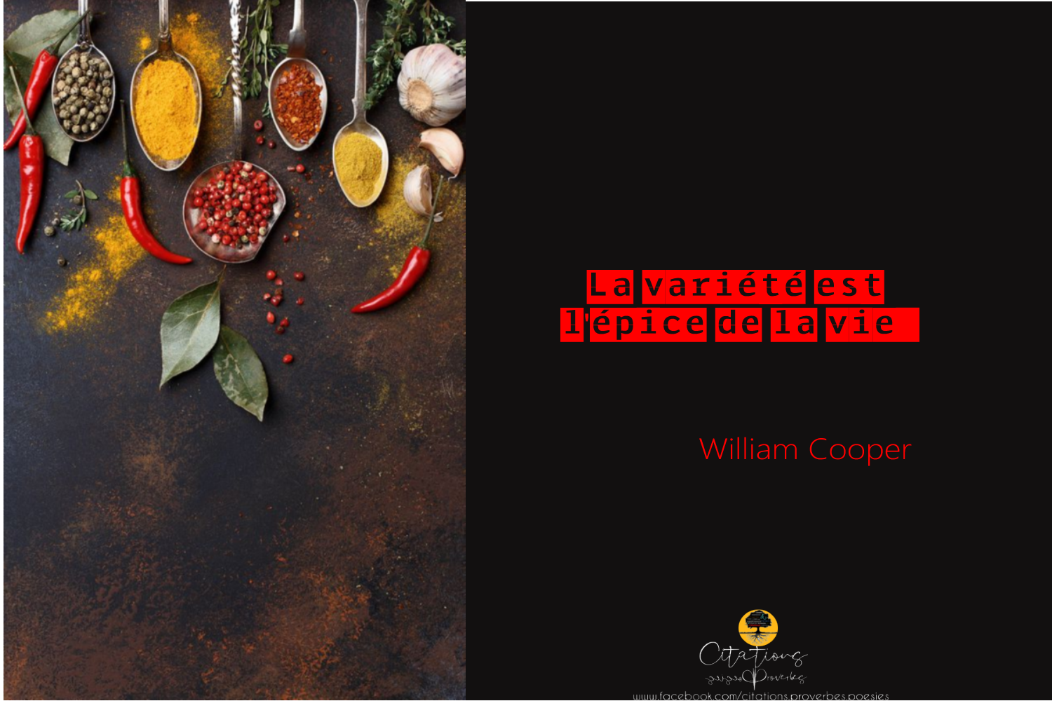 Citations La variété est l’épice de la vie. 157 Share La variété est l’épice de la vie. William Cooper 157 Share
