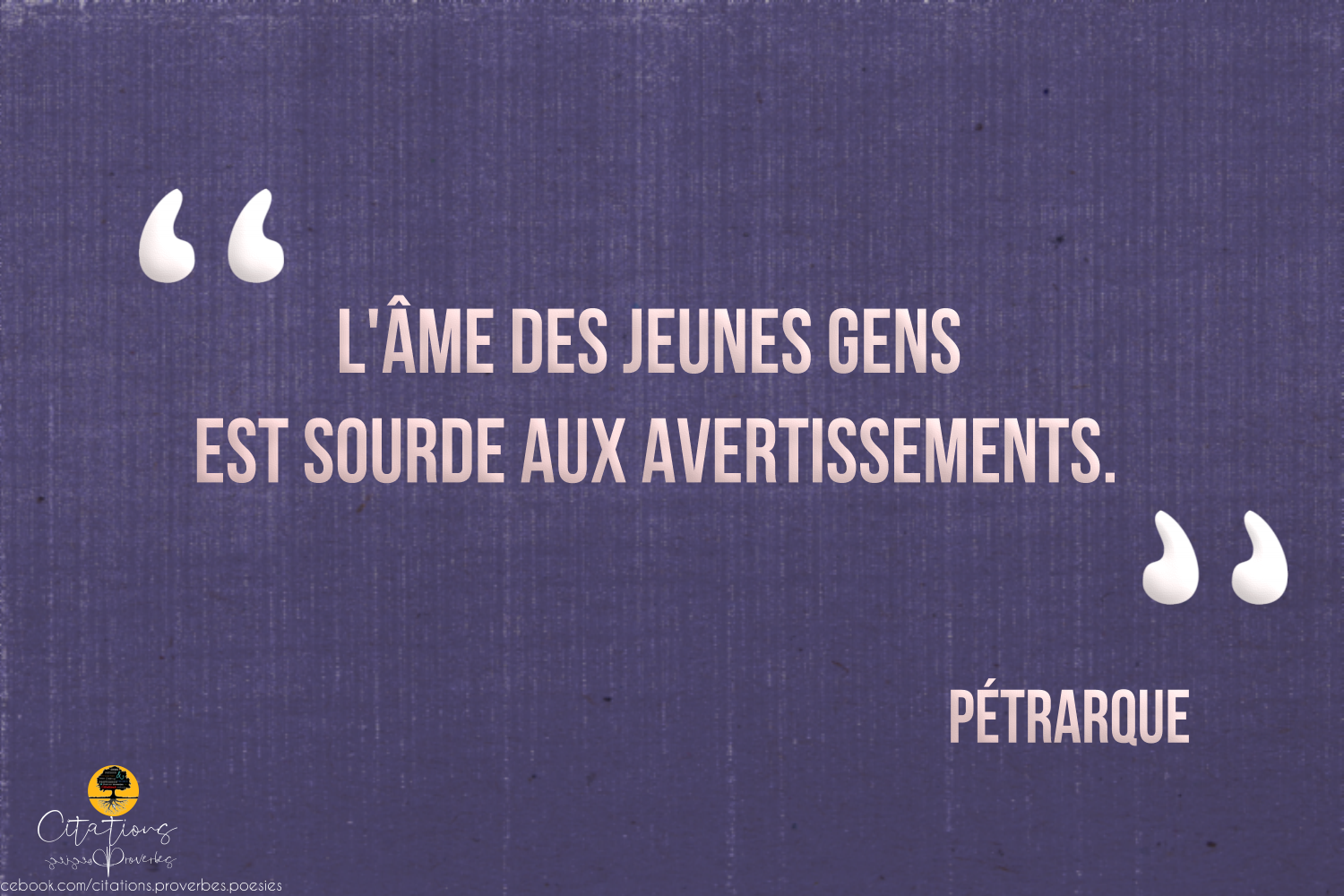 Citations L’âme des jeunes gens est sourde aux avertissements. 44 Share L’âme des jeunes gens est sourde aux avertissements. Pétrarque 44 Share