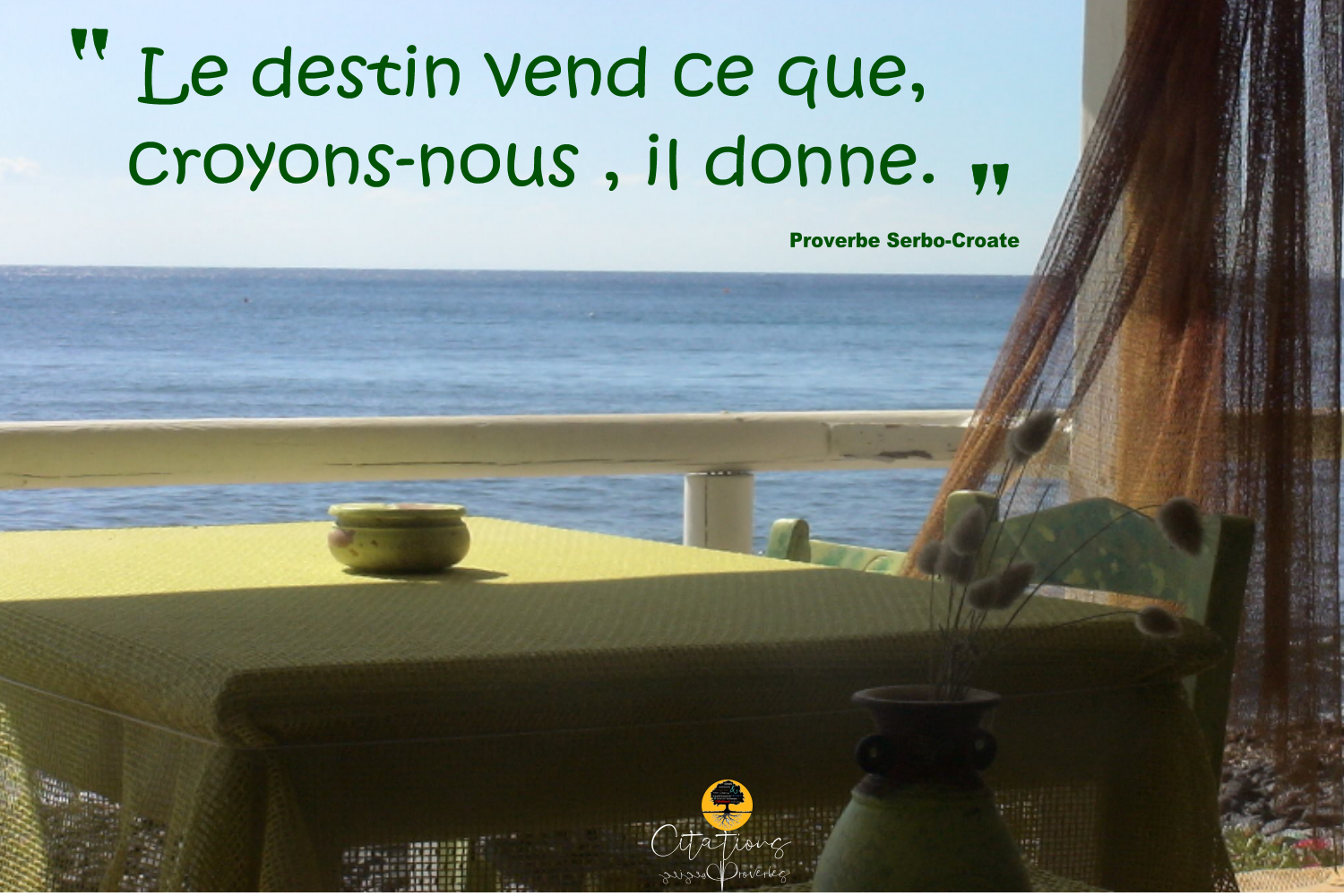 Proverbes Le destin vend ce que, croyons-nous , il donne. 34 Share Le destin vend ce que, croyons-nous , il donne. Proverbe Serbo-Croate 34 Share