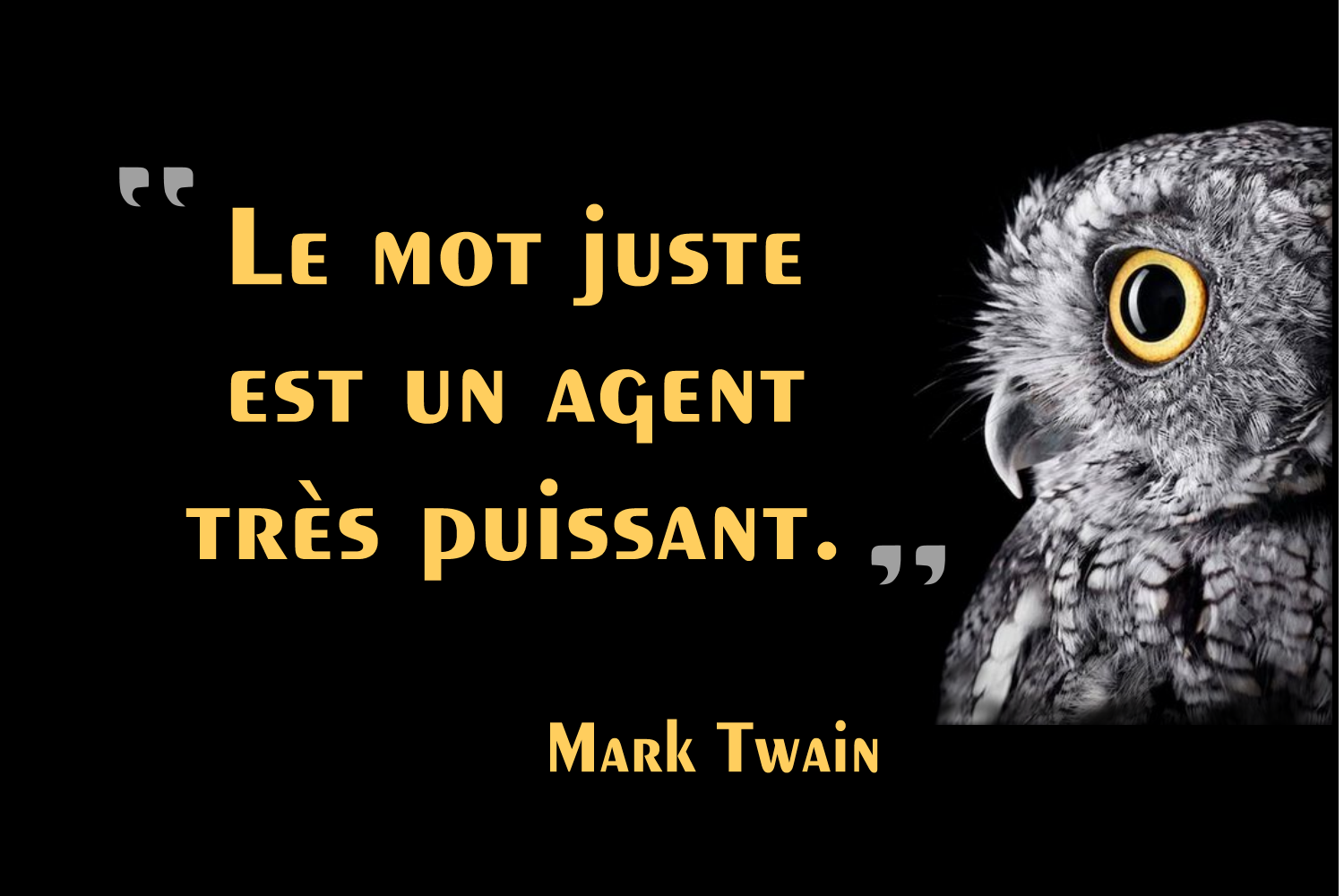 Citations Le mot juste est un agent très puissant. 43 Share Le mot juste est un agent très puissant. Mark Twain 43 Share