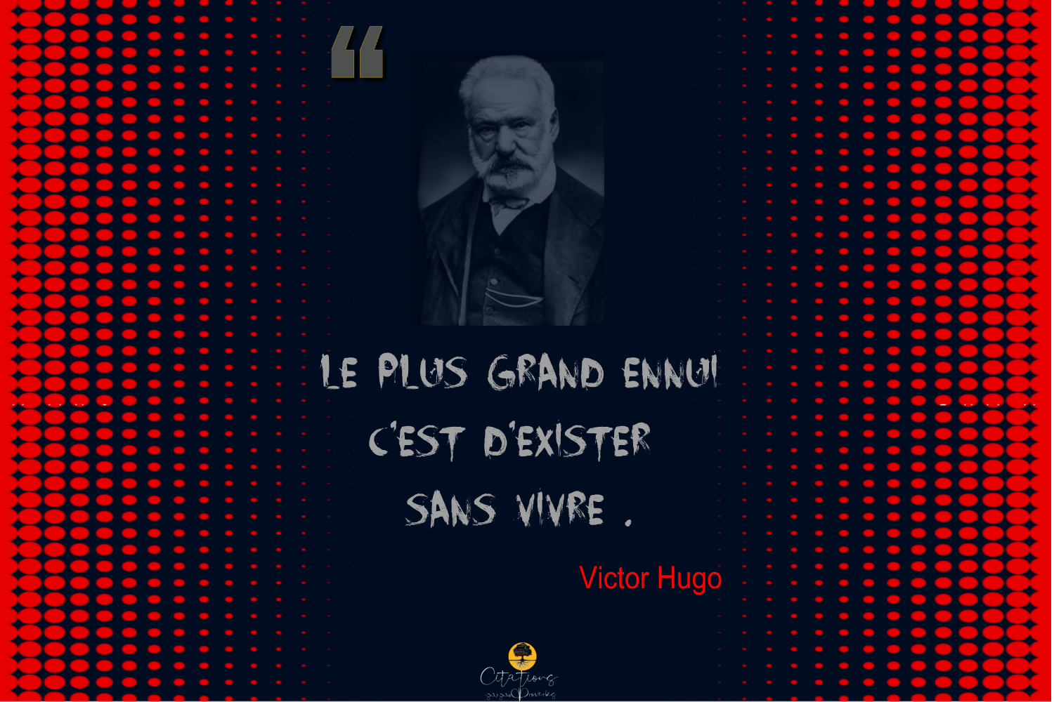 Citations Le plus grand ennui c’est d’exister sans vivre . 222 Share Le plus grand ennui c’est d’exister sans vivre . Victor Hugo 222 Share