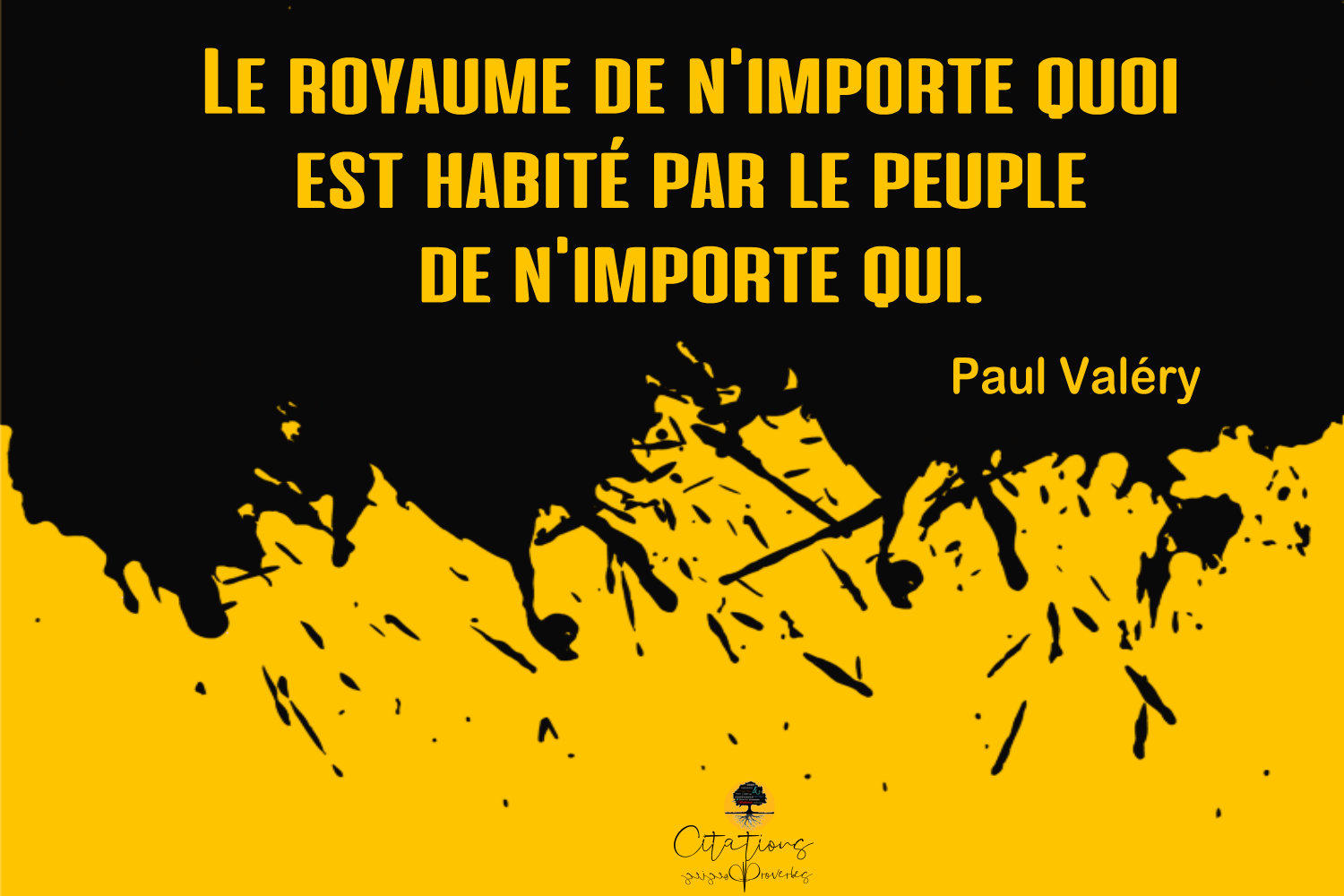 Citations Le royaume de n’importe quoi est habité par le peuple de n’importe qui. 23 Share Le royaume de n’importe quoi est habité par le peuple de n’importe qui. Paul Valéry 23 Share
