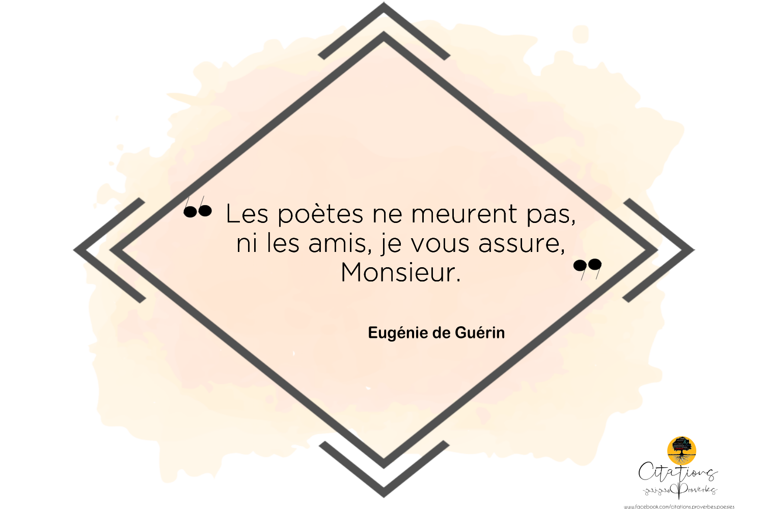 Citations Les poètes ne meurent pas, ni les amis, je vous assure, Monsieur. 15 Share Les poètes ne meurent pas, ni les amis, je vous assure, Monsieur. Eugénie de Guérin 15 Share