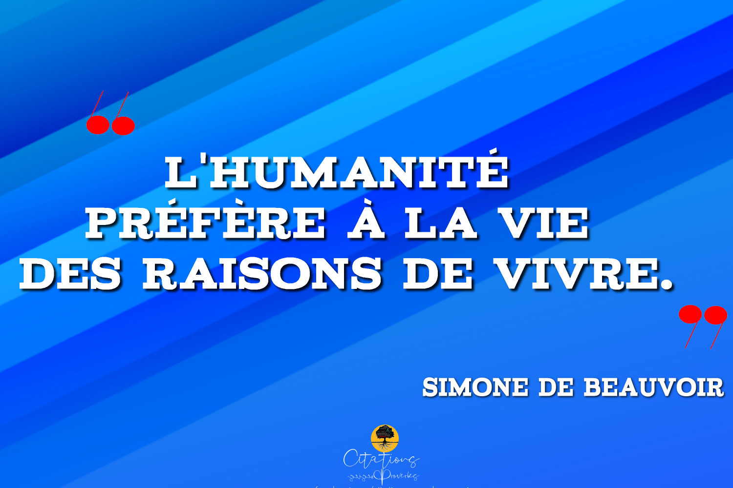 Citations L’Humanité préfère à la vie des raisons de vivre. 42 Share L’Humanité préfère à la vie des raisons de vivre. Simone de Beauvoir 42 Share