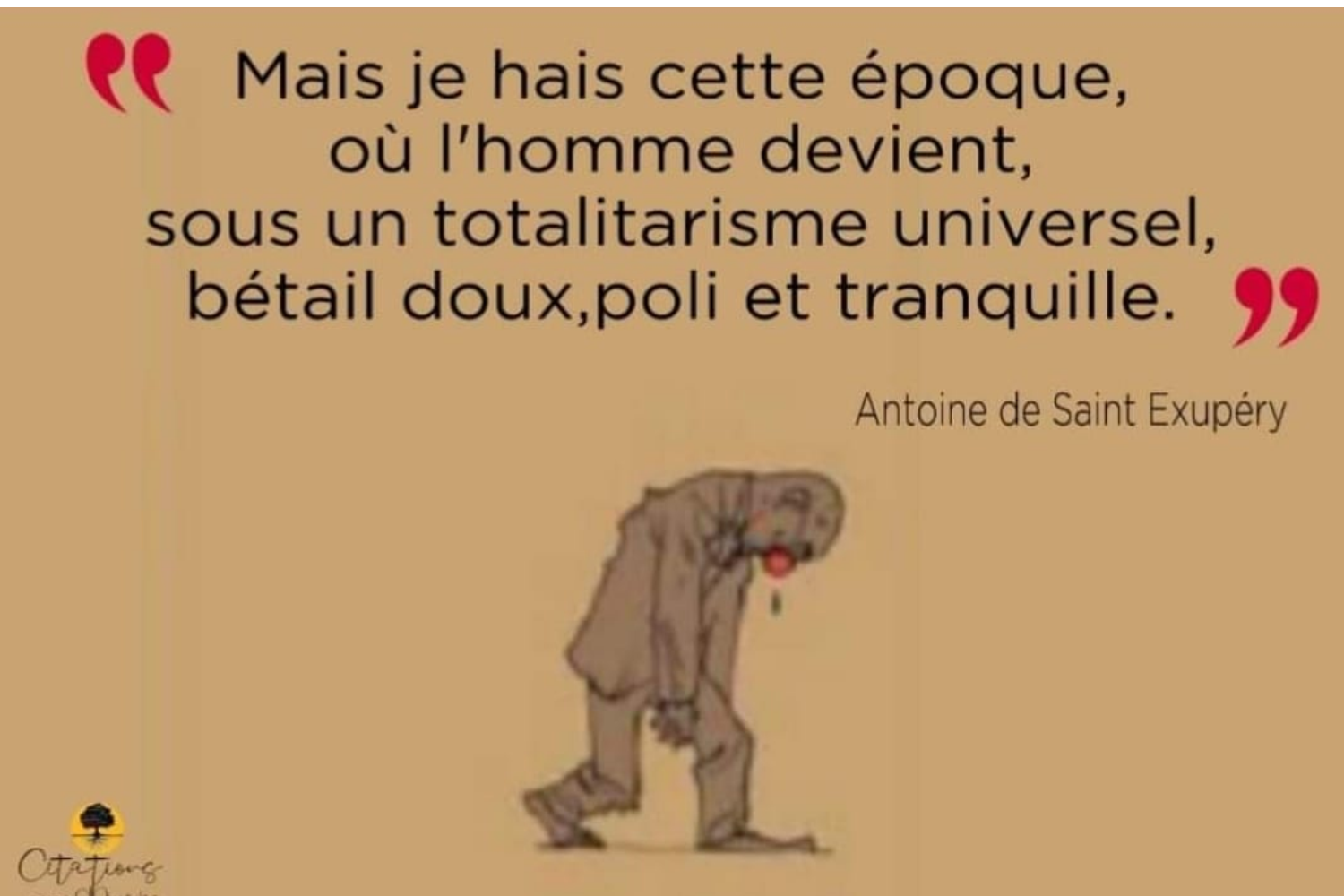 “Mais je hais cette époque, où l’homme devient, sous un totalitarisme universel, bétail doux, poli et tranquille.” Antoine de Saint Exupéry