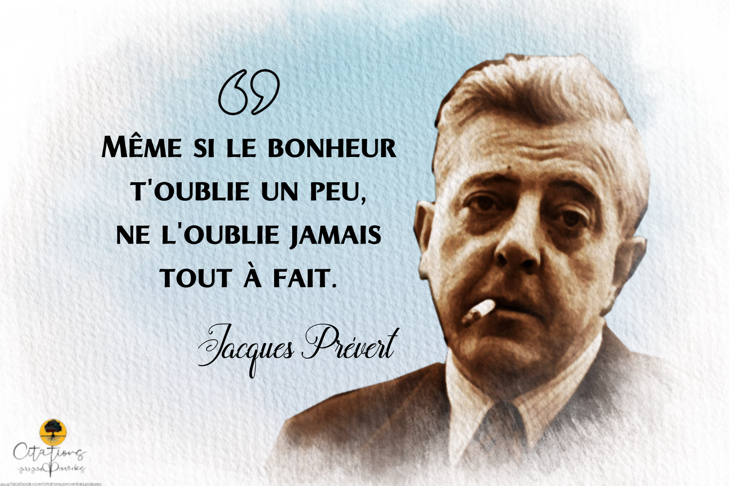 Citations Même si le bonheur t’oublie un peu…. Jacques Prévert 171 Share Même si le bonheur t’oublie un peu, ne l’oublie jamais tout à fait. Jacques Prévert 171 Share