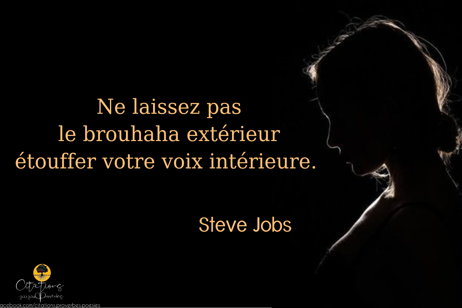 Citations Ne laissez pas le brouhaha extérieur étouffer votre voix intérieure. 189 Share Ne laissez pas le brouhaha extérieur étouffer votre voix intérieure. Steve Jobs 189 Share