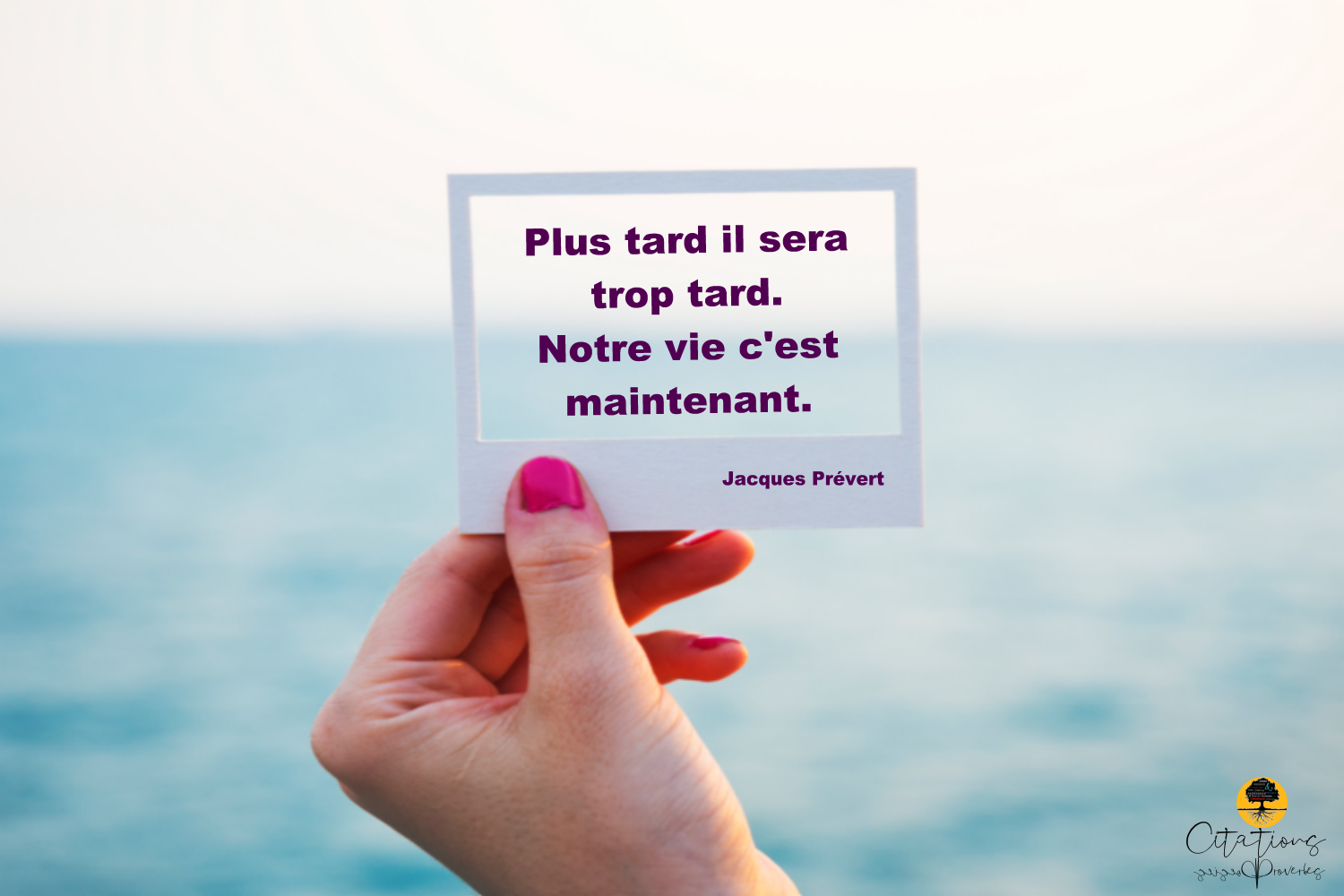 Citations Notre vie c’est maintenant. 95 Share Plus tard il sera trop tard. Notre vie c’est maintenant. Jacques Prévert 95 Share