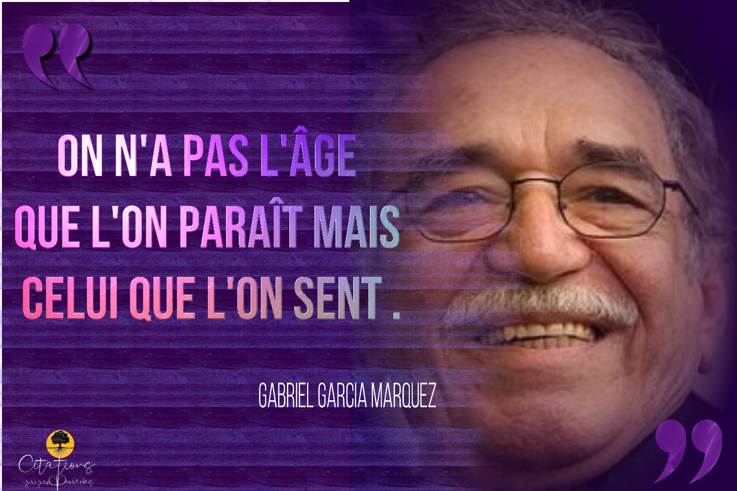 Citations On n’a pas l’âge que l’on paraît mais celui que l’on sent . 32 Share On n’a pas l’âge que l’on paraît mais celui que l’on sent . Gabriel Garcia Marquez 32 Share