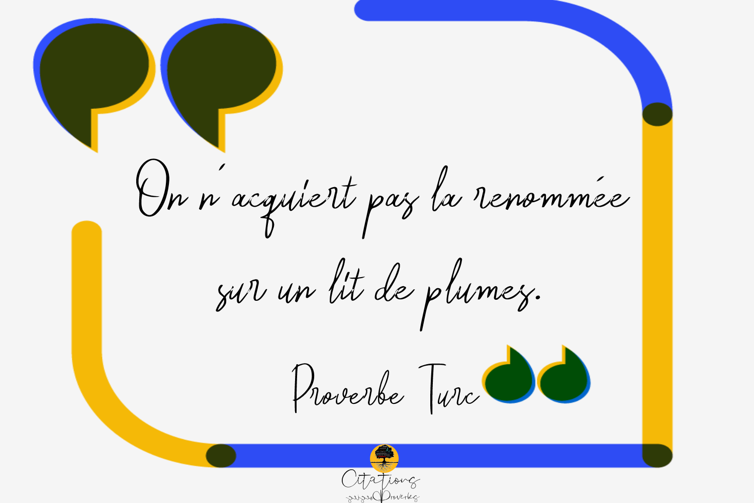 Proverbes On n’acquiert pas la renommée sur un lit de plumes. 165 Share On n’acquiert pas la renommée sur un lit de plumes. Proverbe Turc 165 Share