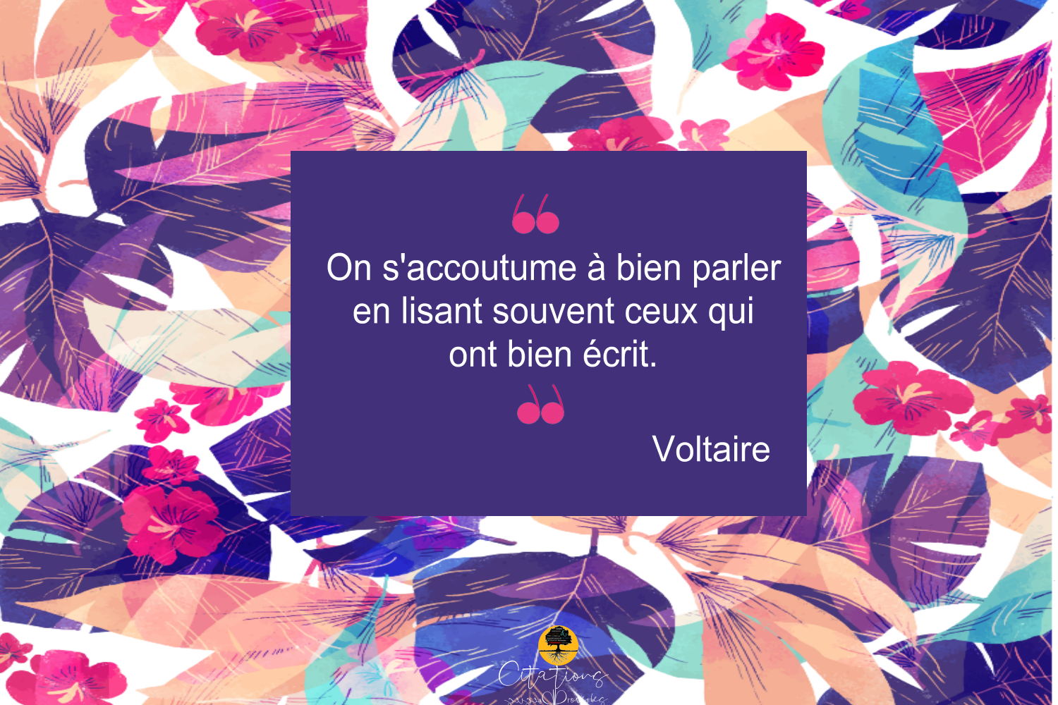 Citations On s’accoutume à bien parler en lisant souvent ceux qui ont bien écrit. 73 Share On s’accoutume à bien parler en lisant souvent ceux qui ont bien écrit. Voltaire 73 Share