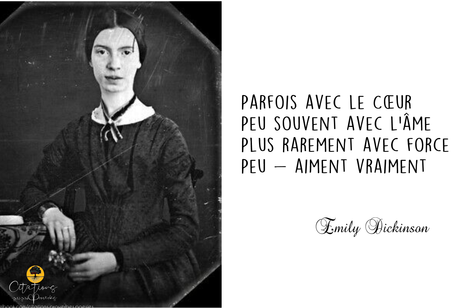 Citations ….Peu – aiment vraiment. Emily Dickinson 182 Share Parfois avec le Cœur Peu souvent avec l’âme Plus rarement avec force Peu – aiment vraiment. Emily Dickinson 182 Share