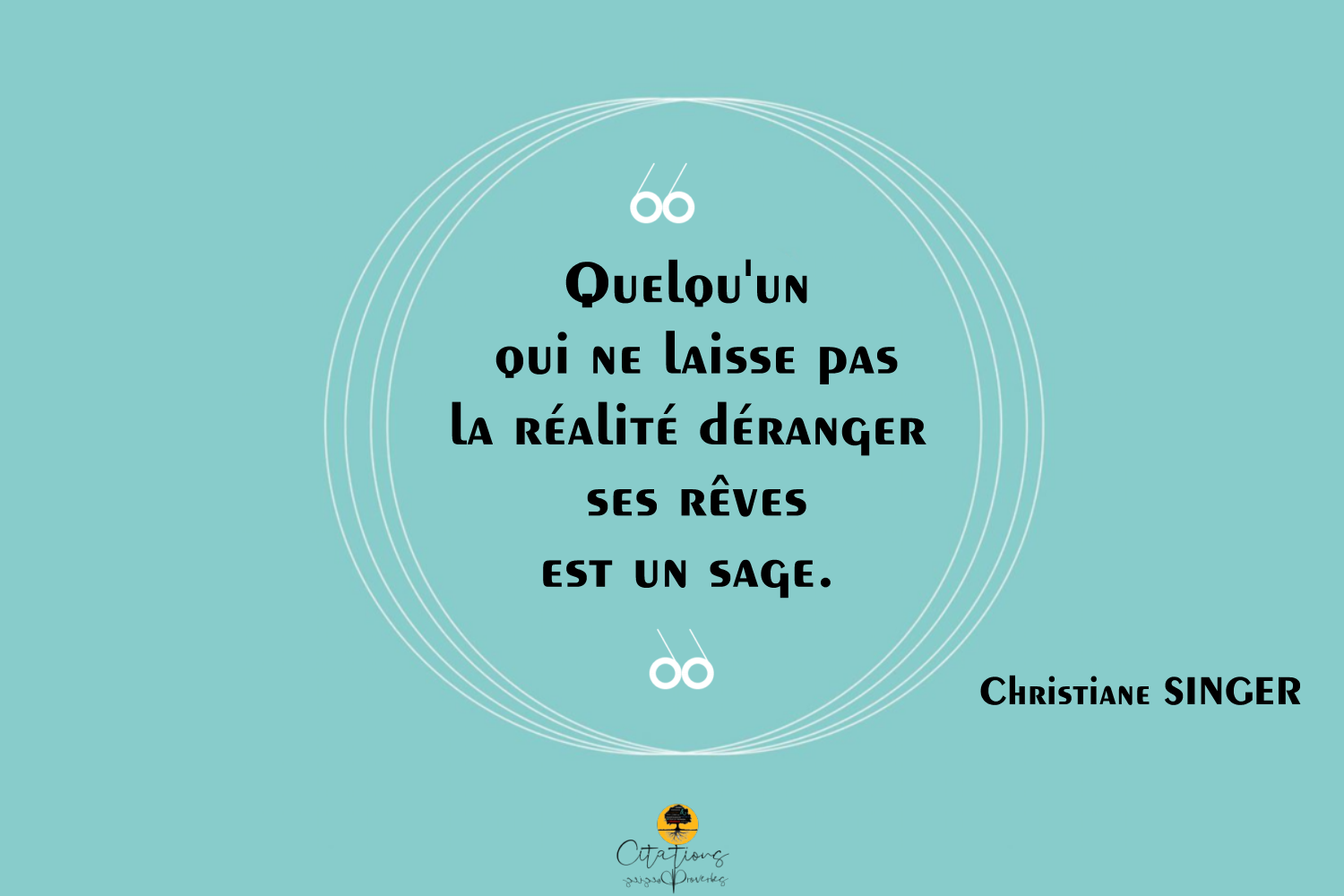Citations Quelqu’un qui ne laisse pas la réalité déranger ses rêves est un sage. 495 Share Quelqu’un qui ne laisse pas la réalité déranger ses rêves est un sage. Christiane SINGER 495 Share