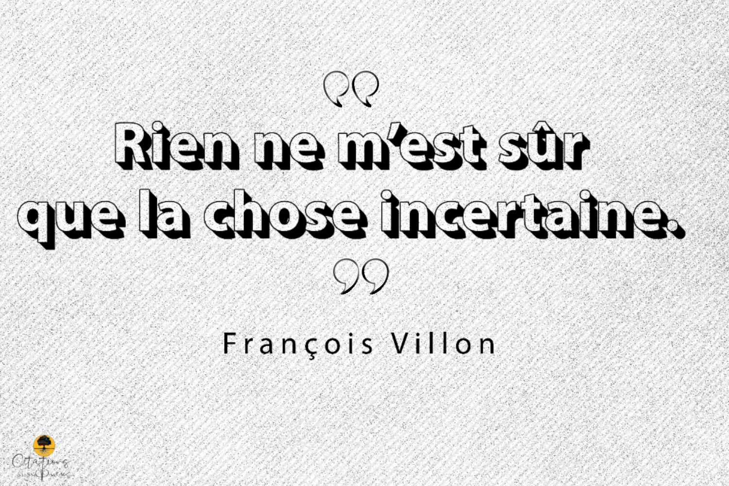 Citations Rien ne m’est sûr que la chose incertaine. 82 Share ” Rien ne m’est sûr que la chose incertaine.” François Villon 82 Share