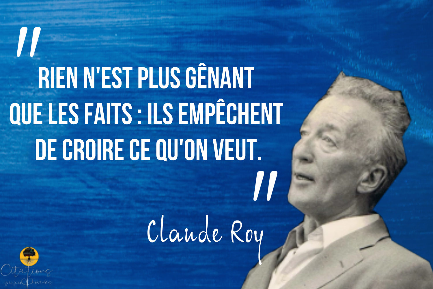 Citations Rien n’est plus gênant que les faits…. 271 Share ”Rien n’est plus gênant que les faits : ils empêchent de croire ce qu’on veut.” Claude Roy 271 Share