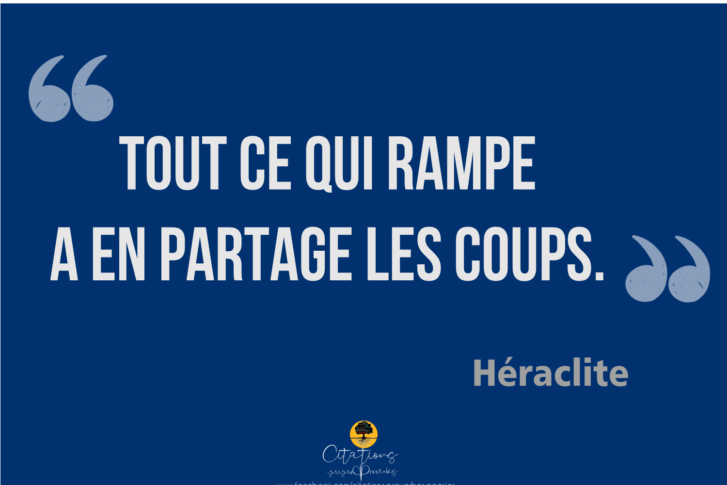 Citations Tout ce qui rampe a en partage les coups. 34 Share Tout ce qui rampe a en partage les coups. Héraclite 34 Share