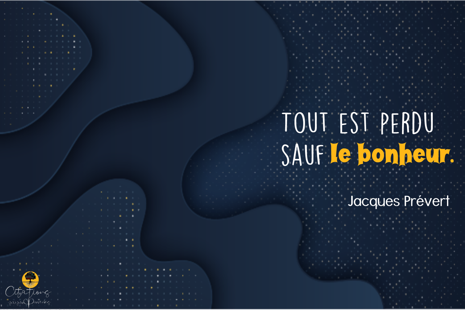 Citations Tout est perdu sauf le bonheur. 302 Share Tout est perdu sauf le bonheur. Jacques Prévert 302 Share