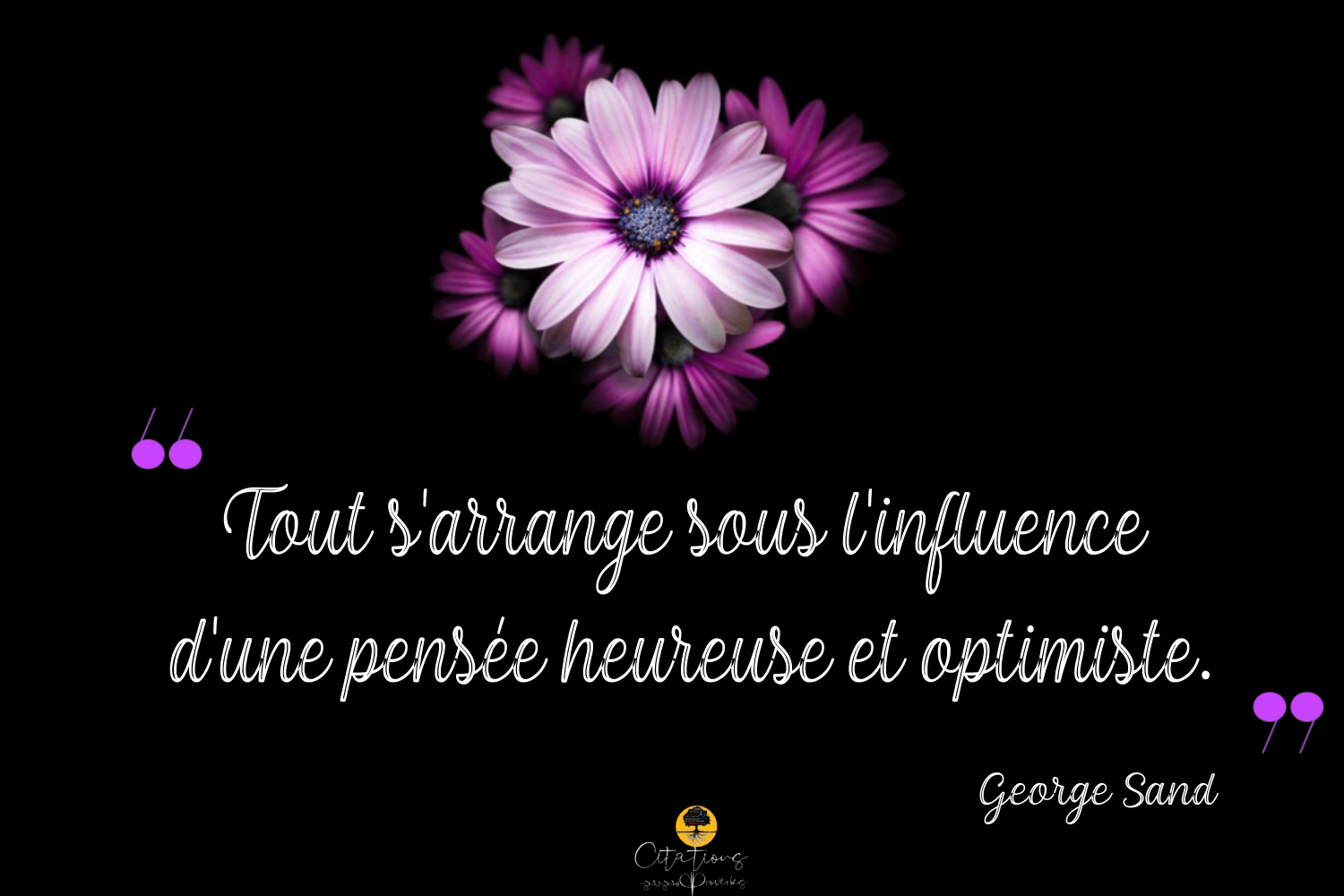 Citations Tout s’arrange sous l’influence d’une pensée heureuse et optimiste. 250 Share Tout s’arrange sous l’influence d’une pensée heureuse et optimiste. George Sand 250 Share