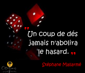 Citations Un coup de dés jamais n’abolira le hasard. 109 Share Un coup de dés jamais n’abolira le hasard. – Stéphane Mallarmé 109 Share