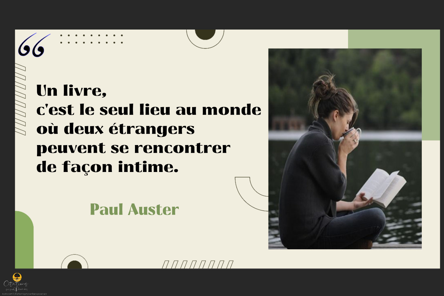 Citations Un livre, c’est le seul lieu au monde…. Paul Auster 415 Share ” Un livre, c’est le seul lieu au monde où deux étrangers peuvent se rencontrer de façon intime.” Paul Auster 415 Share