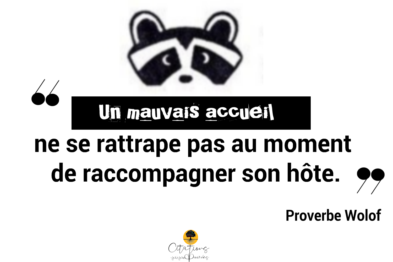 Proverbes Un mauvais accueil…. 131 Share Un mauvais accueil ne se rattrape pas au moment de raccompagner son hôte. Proverbe Wolof 131 Share