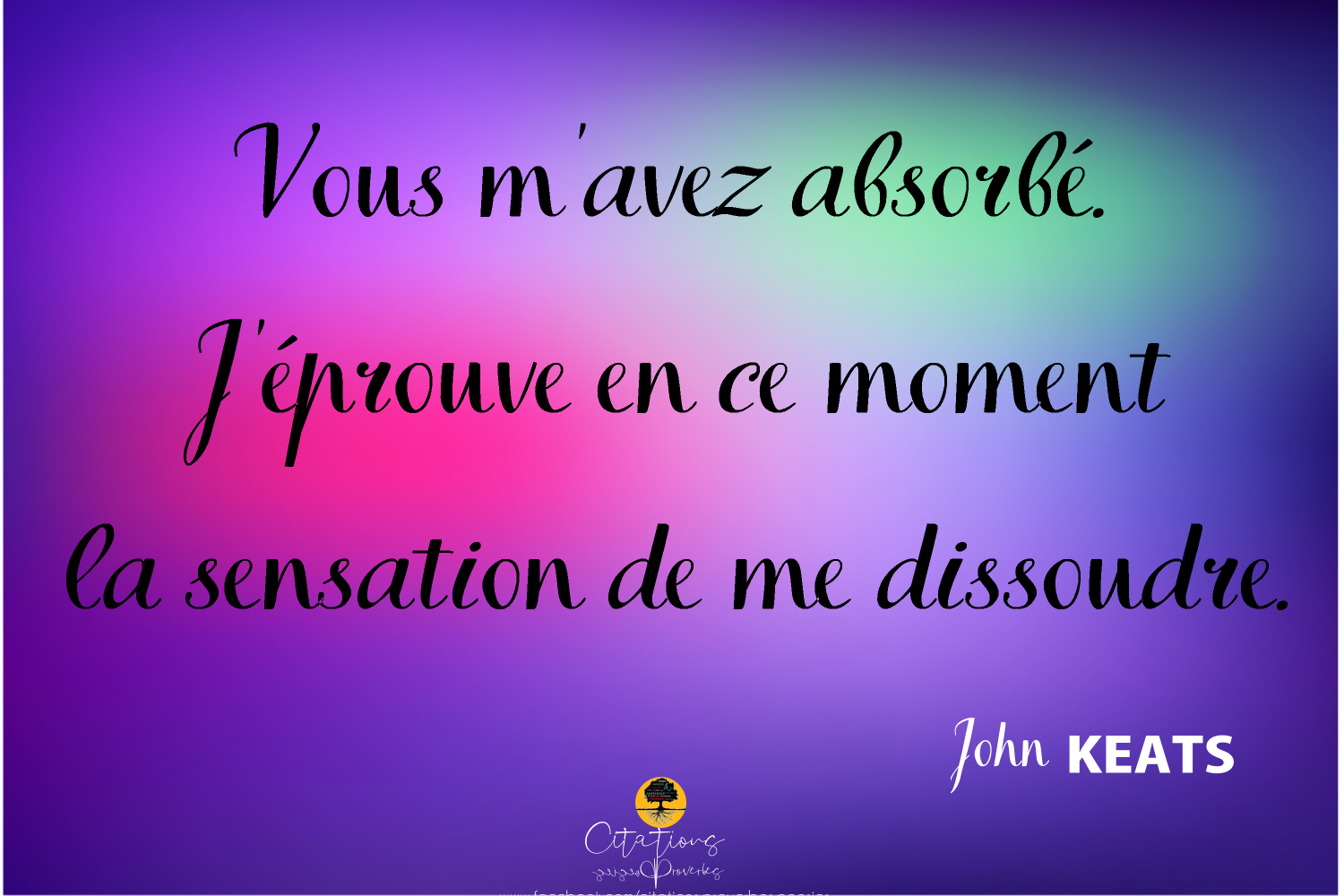 Poésie Vous m’avez absorbé. J’éprouve en ce moment la sensation de me dissoudre. 29 Share Vous m’avez absorbé. J’éprouve en ce moment la sensation de me dissoudre. John KEATS 29 Share